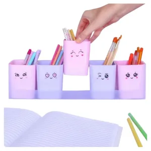 Organizar itens escolares nao e tarefa facil! Lapis, canetas, borrachas e outros objetos se misturam facilmente. O Kit Docura da Dello foi pensado para que essas situacoes nao acontecam. E lindo! E pode facilmente fazer parte da composicao de algum ambiente. Acompanha suporte em Polipropileno com furos para fixacao, 5 porta objetos e cartela de adesivos com 12 carinhas.