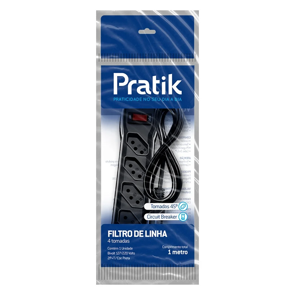 Filtro de Linha Pratik 4 Tomadas 3×0,75mm 10A Cabo 1M SM Preto