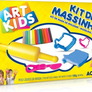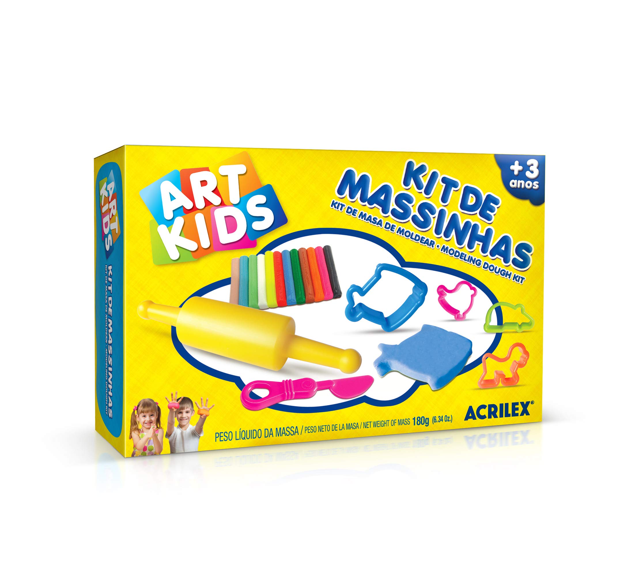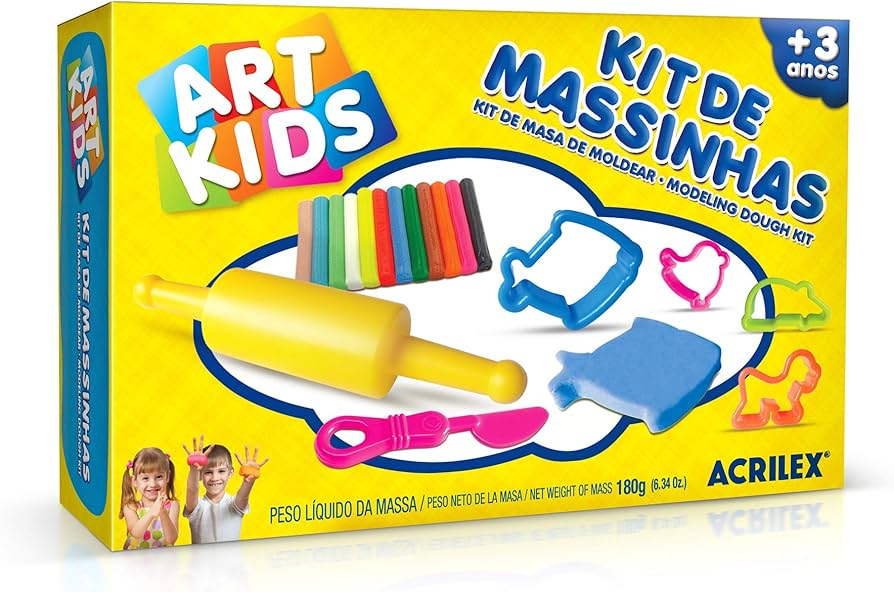 O kit contém: um conjunto de massinha c/12 cores de 180g. 5 moldes, 1 rolinho e 1 faquinha.